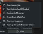 Er zijn verschillende opties om iets te delen. ‘Delen in overzicht’ betekent dat je het deelt op je eigen profiel, maar heb je er ook al aan gedacht om iets te versturen in messenger of te verzenden in WhatsApp? Wie weet heb je een tof groepsgesprek met collega’s die ook geïnteresseerd zouden zijn!